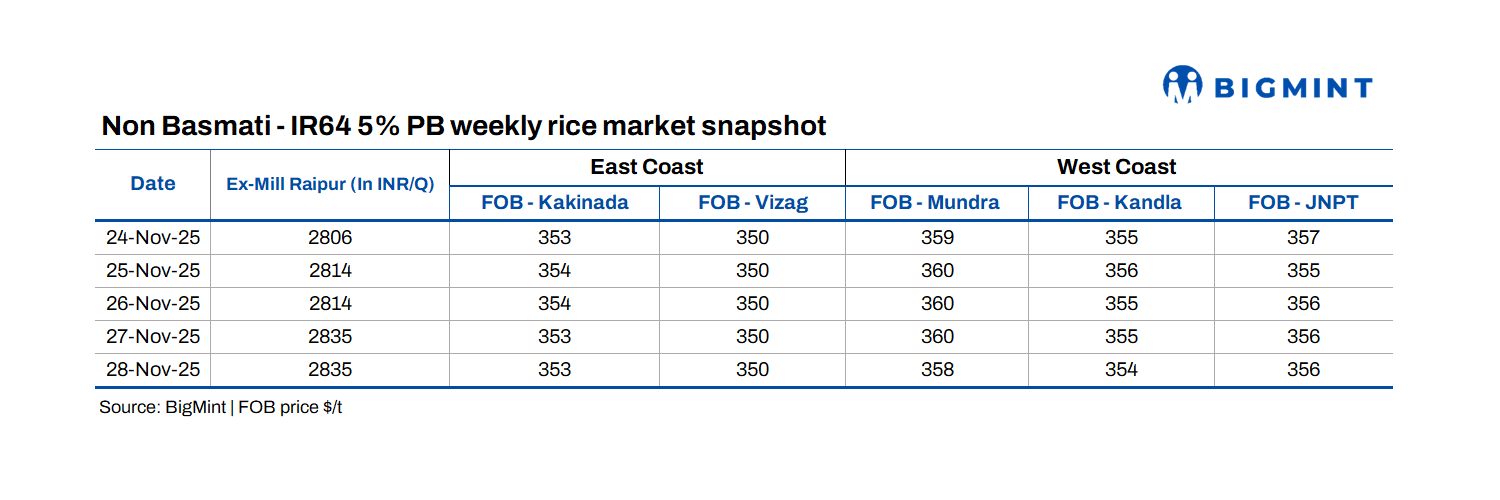 Chhattisgarh’s rice market remained unsettled through the final week of November as delayed government policies, thin trade and tightening paddy availability pushed ex-mill prices higher across the state. The ex-mill rate for IR 64 Parboiled 5% rice in Raipur climbed from INR 2,806 per quintal on 24 November to INR 2,835 by 28 November, reflecting millers’ difficulty in securing raw paddy and buyers’ continued resistance to higher offers.