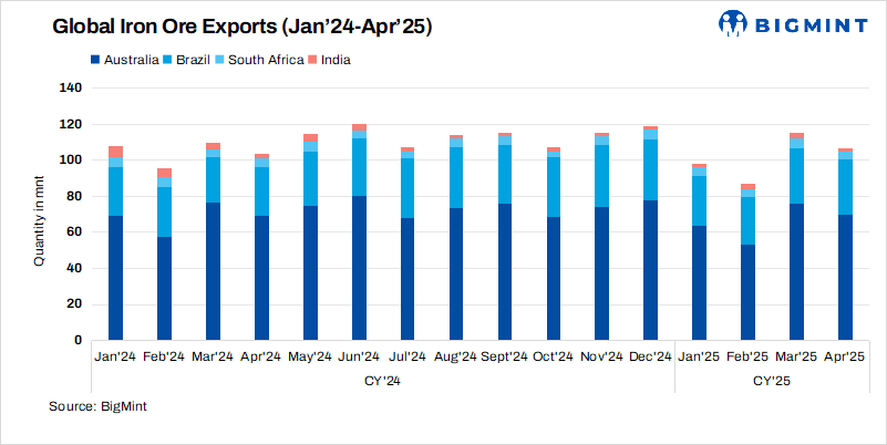Iron ore exports from key geographies showed slight decreases m-o-m in April 2025. Shipments from Australia, South Africa and India dropped, while those from Brazil were stable.