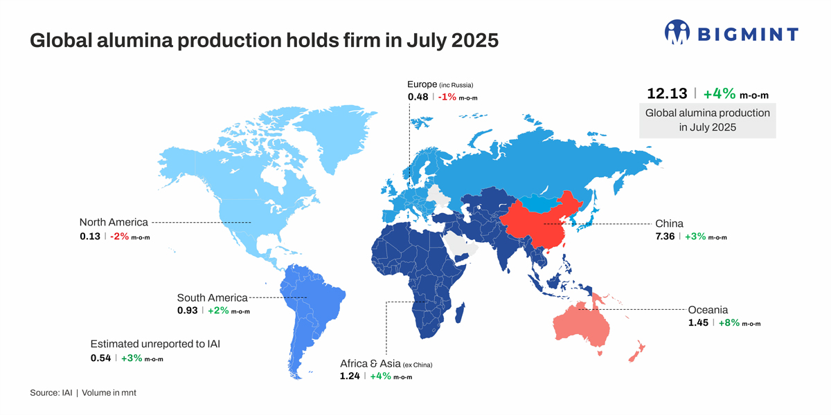 Global metallurgical alumina production rose 4% to 12.13 million tonnes (mnt) in July 2025 from 11.72 mnt in June, supported by stronger refinery operations and fresh capacity additions in Asia, according to the International Aluminium Institute (IAI).