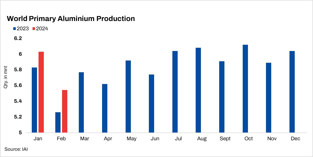 According to the latest data from the International Aluminium Institute (IAI), the aluminium production in Feb’24 has dipped, reaching 5.54 mnt, marking a 8% decrease from 6.03 mnt, m-o-m. Conversely, production witnessed a rise of 5.4% y-o-y from 5.26 mnt in February 2023. Notably, China, as the primary alumina producer, accounted for 3.237 mnt, indicating a 9% decrease from the preceding month’s 3.585 mnt.