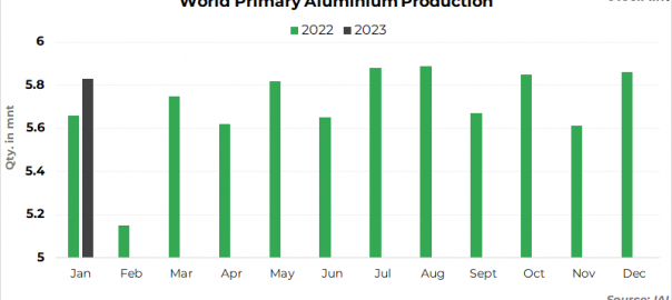 - World’s aluminium production remained largely stable m-o-m with a negligible drop of 0.34% to 5.83 mnt in Jan’23 against 5.85 mnt in Dec’22, as per data from the International Aluminium Institute (IAI).