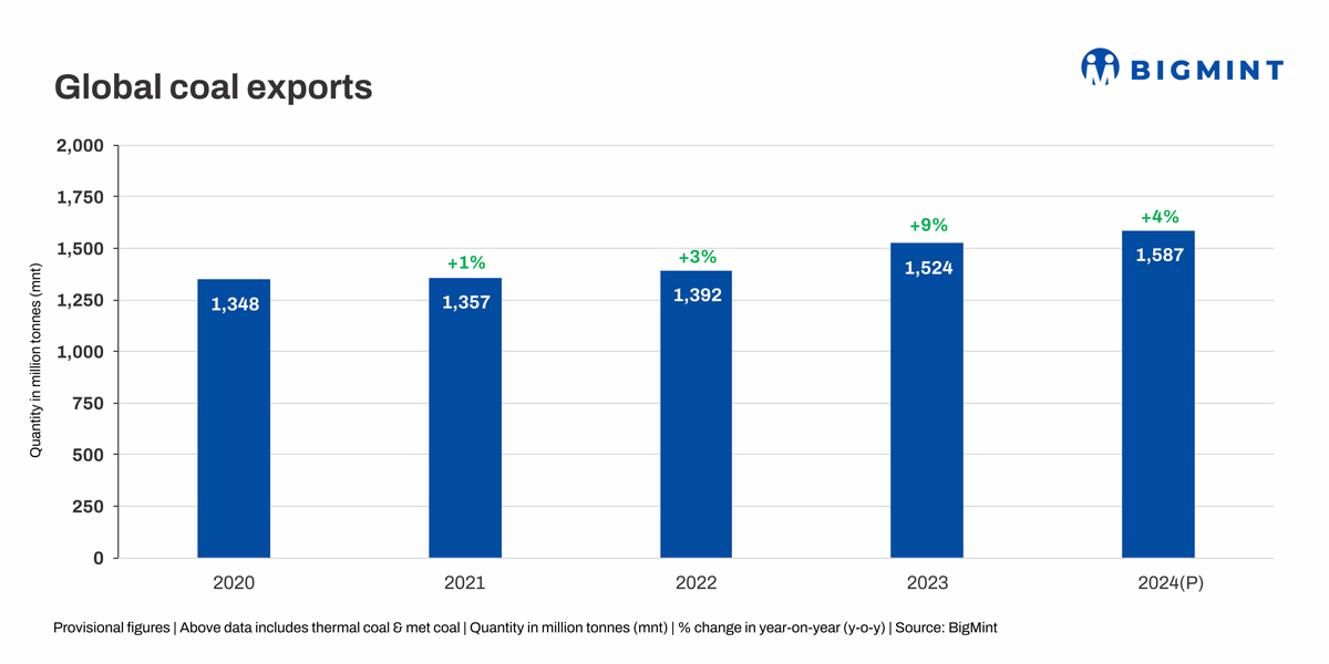 Morning Brief: Amid global energy inflation and intensifying geopolitical crises in different parts of the world, the reliance on coal has actually grown as a cost-competitive and reliable source of energy. Provisional data available with BigMint show that global coal exports (comprising both thermal and metallurgical) in calendar year 2024 (CY’24) posted a growth of over 4% y-o-y to reach 1,587 million tonnes (mnt) – 1.58 bnt – from 1,524 mnt in CY’23.