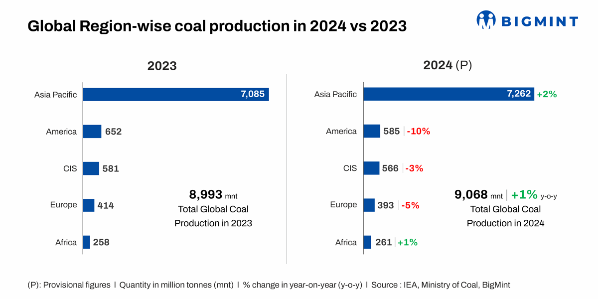 Global coal production increased modestly by 0.8% to 9,068 million tonnes (mnt) in 2024 compared to 8,993 mnt in 2023, as per data maintained by IEA and BigMint.