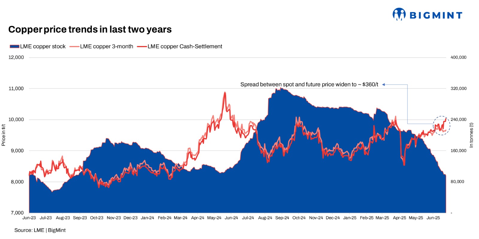 Copper inventories on the LME have plunged 60% since mid-Feb’25 to just around 96,000 t, the lowest since Aug’23, Also, the market inversion (spot price exceeding futures) reached $345/t, the strongest backwardation since 2021. Fearing a potential 10% US tariff, traders ahead of time shifted over 200,000 t of copper to US warehouses in Apr’25. This drained stocks from Europe, Asia, and LME warehouses.