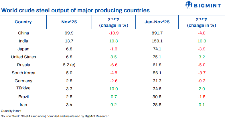 Global crude steel production declined by 4.6% y-o-y to 140.1 mnt in Nov’25, according to the World Steel Association (WSA). Moreover on a monthly basis output edged down by 2.2% m-o-m from 143.3 mnt in Oct’25.
