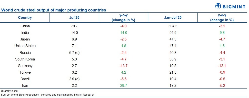 Global crude steel production decreased by 1.3% y-o-y to 150.1 mnt in Jul’25, as per the World Steel Association (WSA), which draws on data from the 70 countries that report to it.