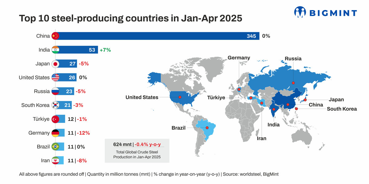 Morning Brief: Global steel production reached 624.4 million tonnes (mnt) in January-April 2025, a marginal decline of 0.4% y-o-y, as per the World Steel Association’s (WSA) recent report for April. The 69 countries that report to WSA accounted for 98% of global crude steel production in CY’24.