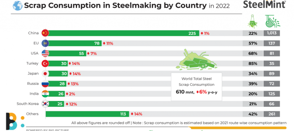 Morning Brief: Global ferrous scrap consumption in crude steel-making dropped around 7% to 610 million tonnes (mnt) in calendar year 2022 (CY22), as per SteelMint’s data. In 2021, the same was at 654 mnt.