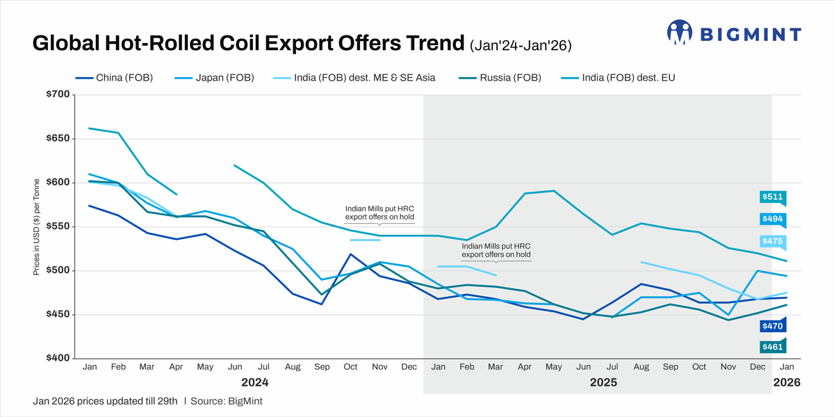 Indian HRC export offers showed mixed trends. BigMints HRC index tracking EU-bound cargoes slid 2% m-o-m, while that for the Middle East and Southeast Asia increased by a minor 1%. Offers to the EU declined as trade slowed sharply following the full implementation of the Carbon Border Adjustment Mechanism (CBAM) from 1 January. Earlier in the month, a source informed BigMint, “Indian mills have fully exhausted their allocated quota for Q1CY26. With the CBAM now in force, buyers are increasingly relying on mills declared emissions values, while the verification process has been initiated by most mills”.