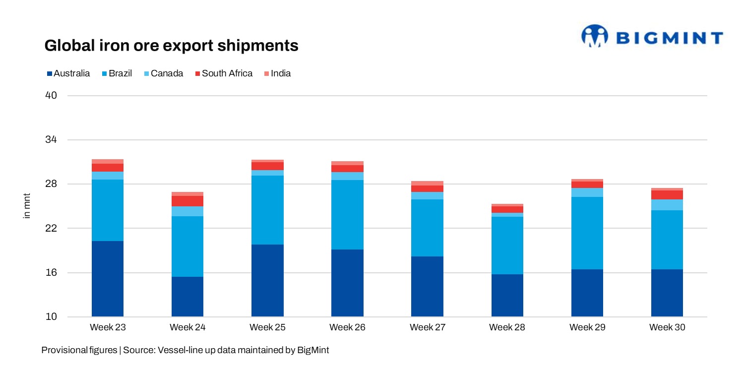 In July 2025, global iron ore and pellet shipments declined 4% w-o-w in Week 30, 2025 (19th-25th July), falling to 27.89 million tonnes (mnt) from 29.10 mnt in Week 29 (12th –18th July), vessel line-up data from BigMint shows. The pullback was driven by easing volumes from Brazil and India amid subdued spot activity and cautious procurement from Chinese mills.