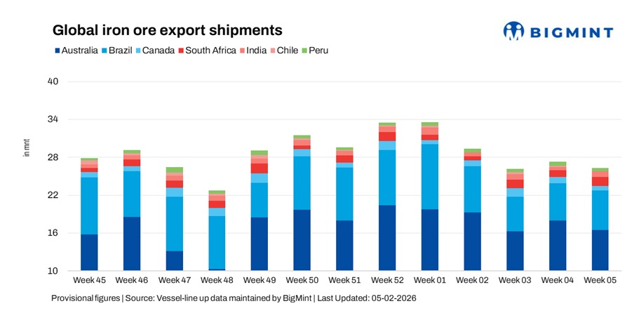 Global seaborne iron ore exports fell 3.5% w-o-w to 26.3 mnt in the week ended 30 January 2026, compared with 27.2 mnt in the previous week, as per vessel line-up data. The decline was led by lower shipments from Australia, Canada, Peru and Chile, which outweighed gains from Brazil, South Africa and India. Freight markets stayed firm on higher bunker costs and stronger fixtures, but export momentum remained capped by cautious chartering and weak Chinese steel margins.