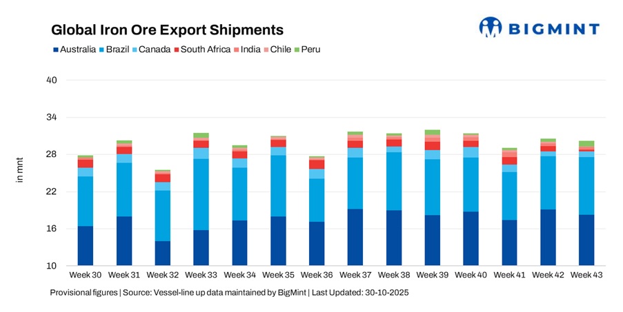 Global iron ore exports edged down 1.9% w-o-w to 30.14 million tonnes (mnt) in week 43 (18-24 October 2025), from 30.73 mnt in week 42 (11-17 October 2025). The marginal decline was led by reduced shipments from Australia, South Africa, India, and Chile, offset partially by higher volumes from Brazil and Peru.