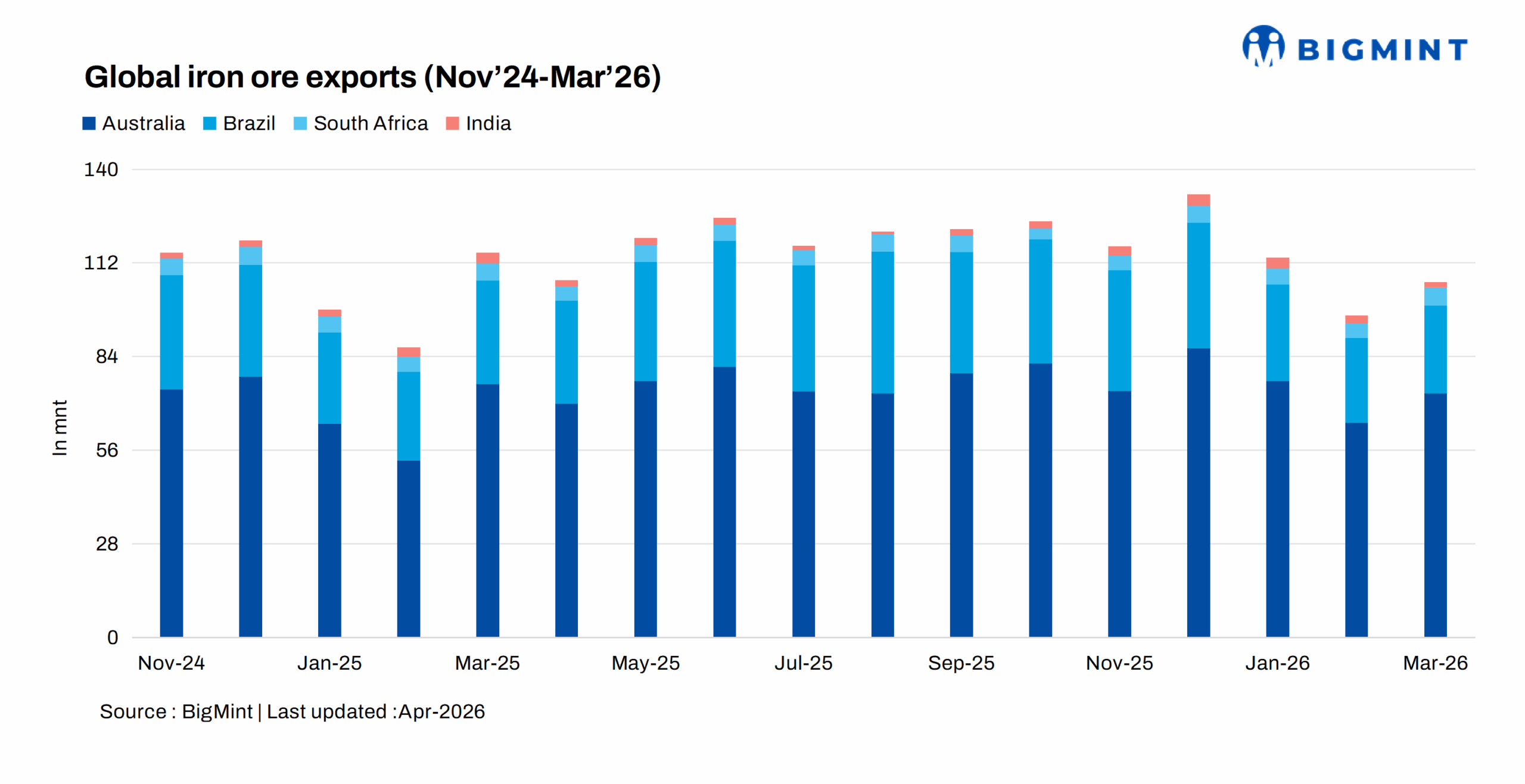 Australia’s iron ore and pellet export shipments stood at 73 million tonnes (mnt) in March 2026, gaining up by 14% against 64.1 mnt in February 2026, according to vessel line-up data compiled by BigMint. However, shipments fell by 4% y-o-y against 75.8 mnt in March 2025.