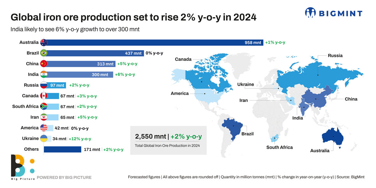 Global iron ore production expected to rise 2% y-o-y in CY’24 to over 2.5 bnt