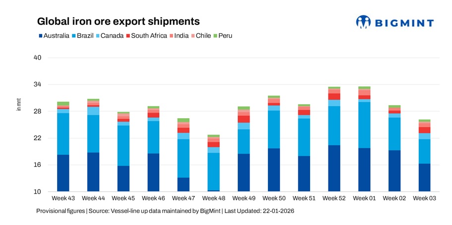 Global seaborne iron ore exports fell 11.1% w-o-w to 26.2 million tonnes (mnt) in the week ended 16 January 2026, down from 29.5 mnt in week 02 (03-09 January), as per BigMint’s vessel line-up data. The decline extended the post-holiday slowdown, with weak freight sentiment and cautious chartering continuing to limit shipment momentum.