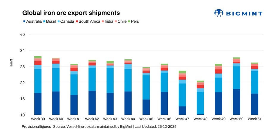 Global seaborne iron ore exports declined 6.5% w-o-w to 29.50 million tonnes (mnt) in the week ended 19 December, down from 31.56 mnt in the previous week, according to BigMint’s vessel line-up data. The moderation was primarily driven by lower shipments from Australia and India, which outweighed steady exports from Brazil and a sharp rebound in South African volumes.