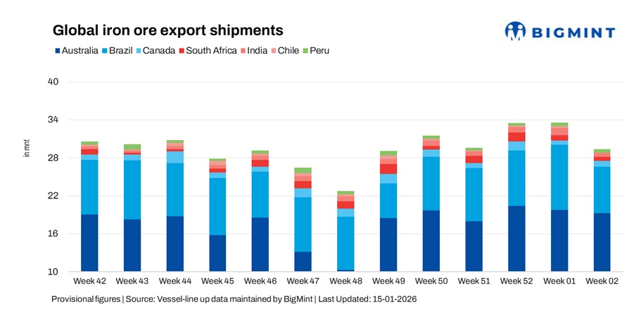 Global seaborne iron ore exports declined 12.6% w-o-w to 29.5 million tonnes (mnt) in the week ended 9 January, down from 33.7 mnt in week 01 (27 December-02 January), according to BigMint’s vessel line-up data. The decline marked a clear post-holiday correction, as cargo nominations slowed across major exporting regions following the release of deferred late-December shipments in the previous week.