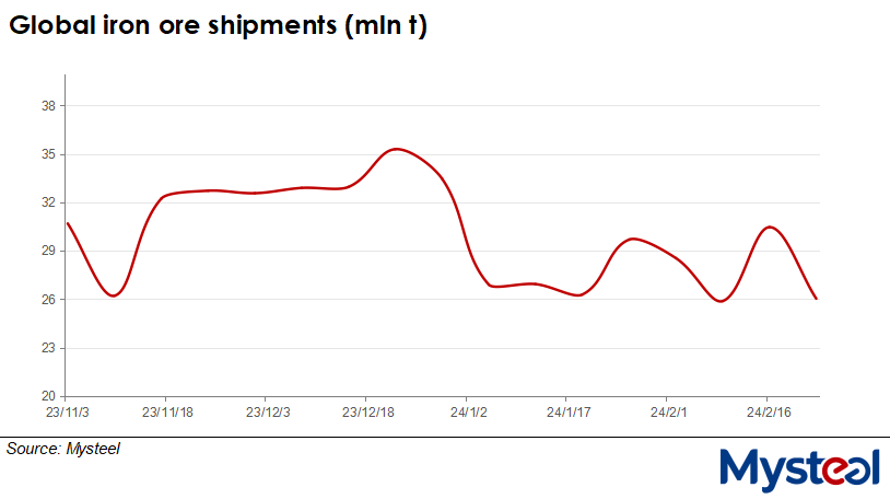 Consequently, the total volume of iron ore shipments dispatched to global destinations from the 19 ports and 16 mining companies in Australia and Brazil under Mysteel’s regular survey plunged by 16.1% on week, totaling 20.8 mnt during 19-25 February.
