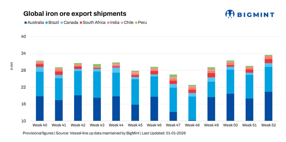Global seaborne iron ore exports increased 13.5% w-o-w to 33.49 million tonnes (mnt) in the week ended 26 December, up from 29.50 mnt in the previous week, according to BigMint’s vessel line-up data. The rebound was primarily driven by stronger shipments from Australia, Brazil, India, Canada, and South Africa, which collectively outweighed continued weakness across some smaller exporting regions.