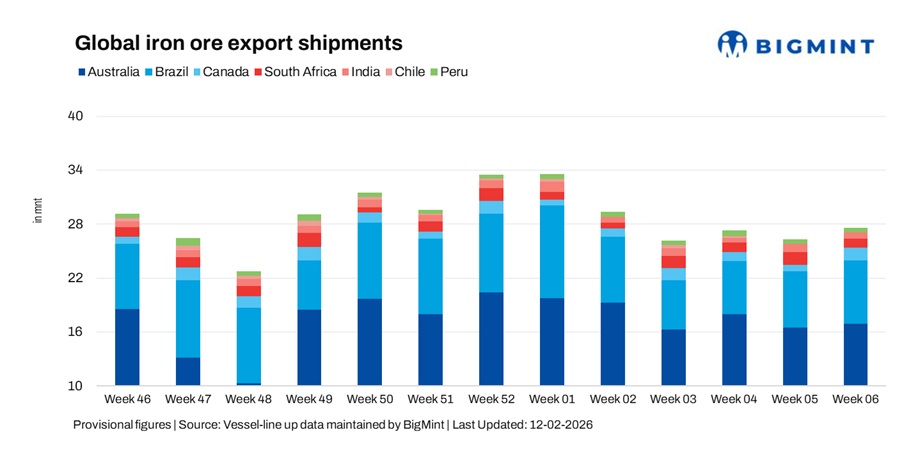 Global seaborne iron ore exports rose 4.8% w-o-w to 27.5 mnt in the week ended 06 February 2026, compared with 26.3 mnt in the previous week, as per vessel line-up data. The increase was supported by higher shipments from Brazil, Canada, and Australia, which outweighed declines from South Africa, India, and Peru. Export momentum strengthened on improved cargo scheduling and stronger long-haul flows, although overall market sentiment remained cautious amid softer Chinese demand signals and a seasonal slowdown around the Lunar New Year.