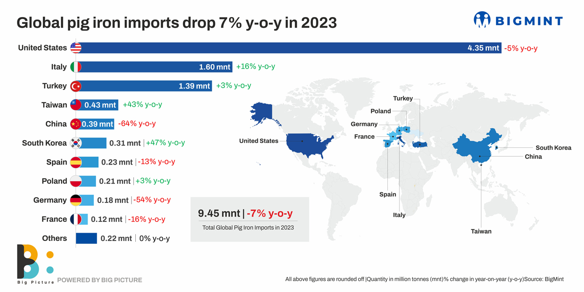 Global pig iron imports fell by around 7% y-o-y in calendar 2023 (CY’23), reveals data maintained with BigMint. Total imports by the top 15 countries dropped to 9.45 million tonnes (mnt) last year against over 10 mnt seen in 2022. The United States was the highest importer with 4.35 mnt, which was a 5% drop against 4.58 mnt in 2022. Italy, ranked second, showed a 16% increase but its volumes are far lower at 1.60 mnt (1.38 mnt in 2022). Among the rest of the top five importers, Turkiye showed a nominal 3% increase to 1.39 mnt (1.36 mnt) while Taiwan’s volumes rose 43% but on a low base of 0.43 mnt (0.30 mnt). China, at fifth place, recorded a steep 64% decline to 0.39 mnt (1.08 mnt).