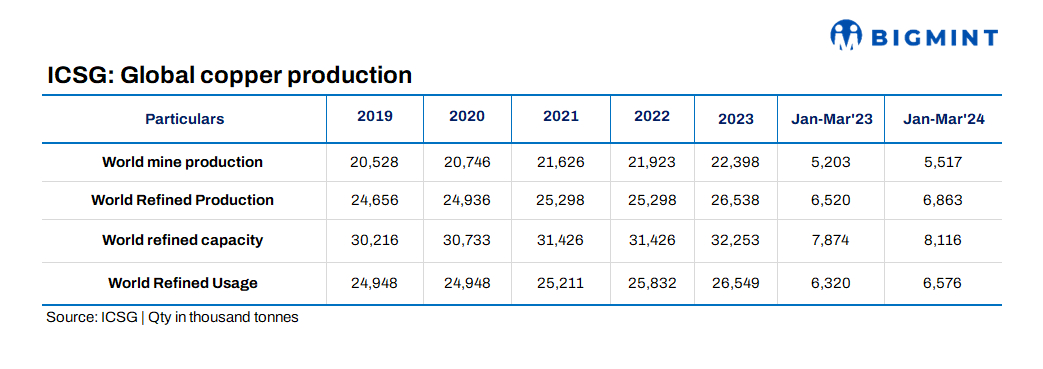 World copper mine production increased by about 6% in the first quarter of 2024 reaching 5.52 million tonnes (mnt) compared to 5.20 mnt during the same period last year, This growth was driven by a recovery from 2023’s lower output in Chile, Indonesia, Peru, and the US, as well as additional output from new mine projects reaching full capacity, particularly in the DRC.