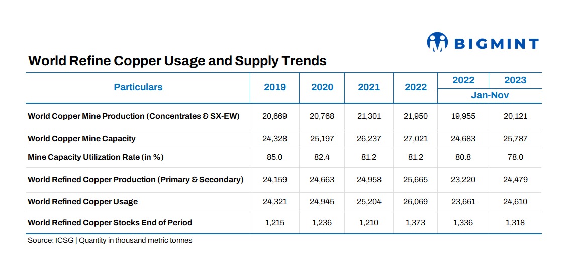 Between January and November 2023, worldwide refined copper usage rose by 4%. Global refined copper usage growth has been primarily driven by robust demand in China, where apparent demand, excluding changes in bonded/unreported stocks, increased by approximately 9%.