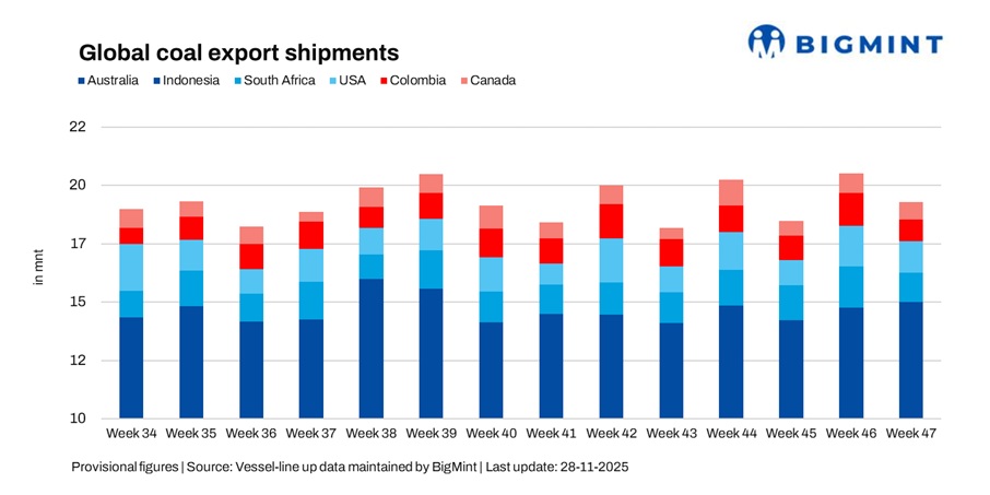 Global seaborne coal exports fell 5.7% w-o-w to 18.96 million tonnes (mnt) in week 47 (15-21 November 2025) from 20.09 mnt in week 46 (8-14 November), according to BigMint’s vessel line-up data. The pullback was led by a steep drop in shipments from South Africa and Colombia, while declines in Australia, the US and Canada further contributed to the softness. Indonesia acted as the only major support to total volumes, recording a strong rebound after two muted weeks.