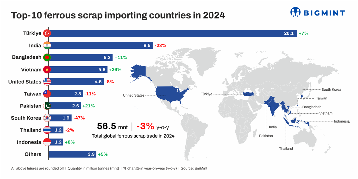 Turkiye, the largest importer of ferrous scrap, saw imports rising by 6.6% y-o-y to 20.07 mnt in CY’24 from 18.82 mnt in CY’23. This was due to a 10% growth in crude steel production, which reached 37 mnt in CY’24.
