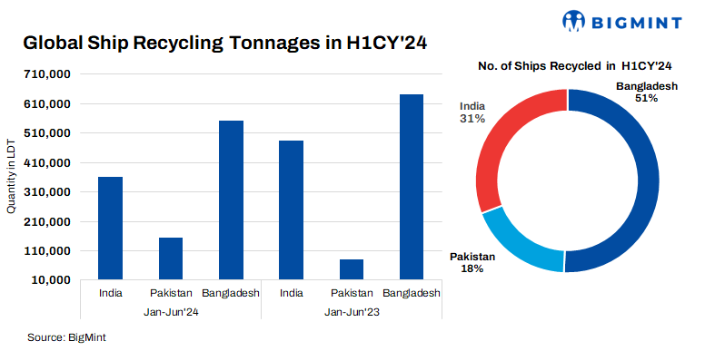 Bangladesh remained the largest ship-breaker globally in terms of tonnage similar to last year. However, it concluded the first half of the year with total tonnage dropping over 14% to 551,060 LDT against 641,197 LDT in H1CY23. It also led in terms of vessels demolished, at 79 units compared to 93 in H1CY23, down by 15% y-o-y.