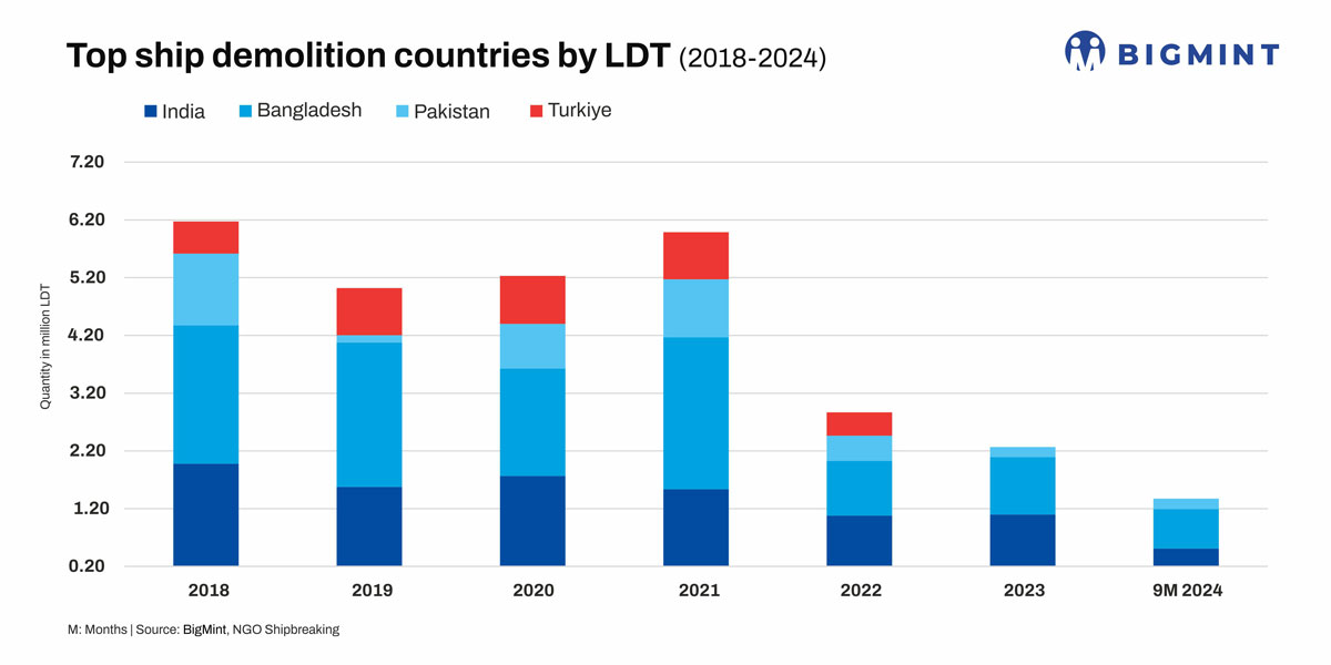 Morning Brief: The global ship-breaking market remained in deep waters in the first nine months (January-September) of 2024 (9MCY’24). Total tonnage sunk 22% to 1.38 million light displacement tonnage (LDT) compared to 1.77 million LDT in the same period of 2023, as per data available with BigMint.