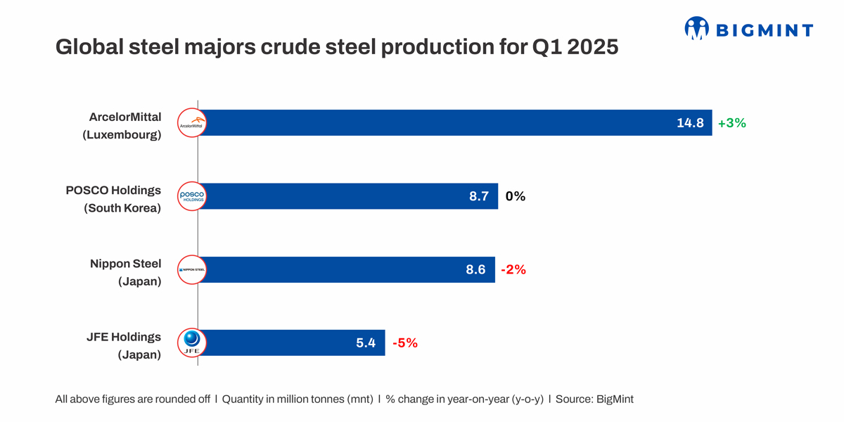 Nippon Steel, JFE Holdings, ArcelorMittal, Hyundai Steel, and POSCO Holdings, major players in the global steel industry, have published their consolidated financial results for Q1CY’25 (January-March 2025). Notably, POSCO and JFE posted lower crude steel output q-o-q. Additionally, all these steelmakers recorded a decline in revenue.