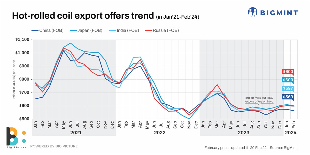 Chinese HRC offers dropped by $11/t to $563/tonne ($574/t in January, 2024). Japanese HRC offers fell by $10/t to $600/t ($610/t) while Indian mills, which had re-entered the market in January, after a three-month gap, saw their offers dipping marginally to $597/t ($601/t).