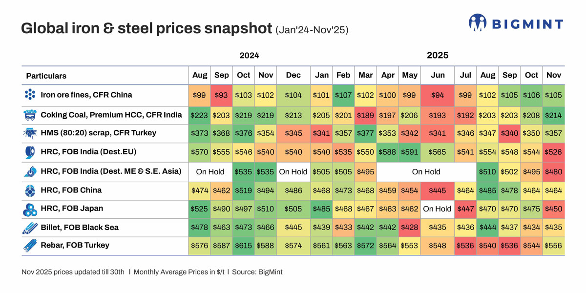 Morning Brief: Global steel and raw material prices recorded mixed trends m-o-m in November. While prices (monthly averages) increased across the scrap, billet, and rebar segments, flats fared comparatively poorly, with Indian and Japanese hot-rolled coil (HRC) export offers sliding m-o-m. However, Chinese HRC offers remained stable m-o-m due to firm iron ore and coking coal costs.