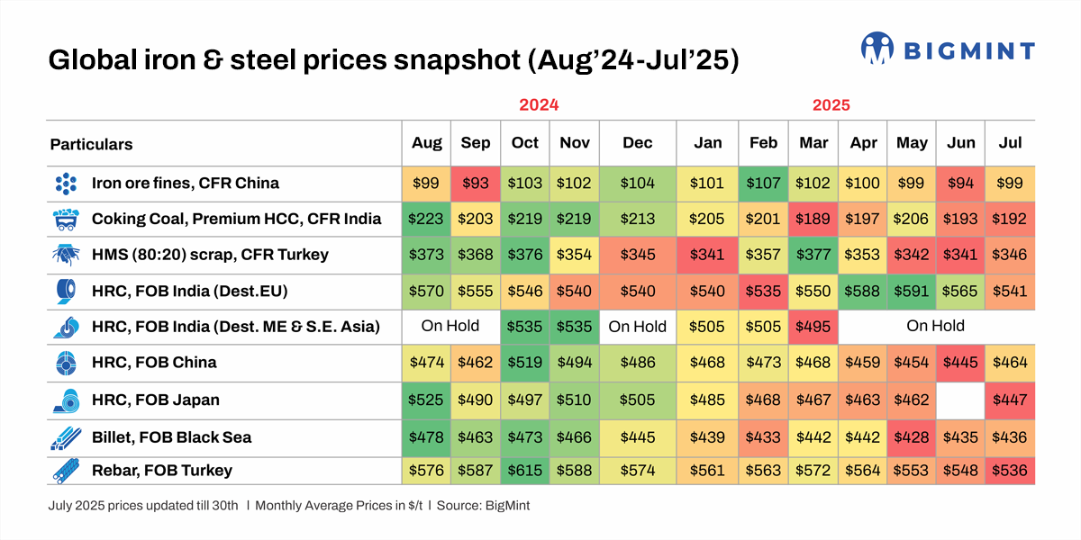 - China’s imported iron ore prices showed slight recovery in July, though average prices for the month remained below the $100-mark. Prices remained under pressure since mid-May, with the government announcing crude steel production cuts in CY’25. However, prices appreciated in the beginning of July, driven by positive macroeconomic signals, improved futures sentiment, and supportive policy news. Better margins of steel mills and regional sintering cuts led to enhanced lump demand, providing price support. Market sentiments improved following higher finished steel sales.