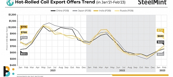 Global hot rolled coil export offers hit an 8-month high in February, as per SteelMint data. Prices from the four key supplier markets China, Japan, India and Russia – which together enjoy almost 45% of the global seaborne export trade – rose by an average over $40/tonne (t) m-o-m in February 2023. Nearabout levels were last seen in June 2022. However, m-o-m, India showed the steepest increase in February, by almost $70/t to $712/t FoB ($644/t in January).