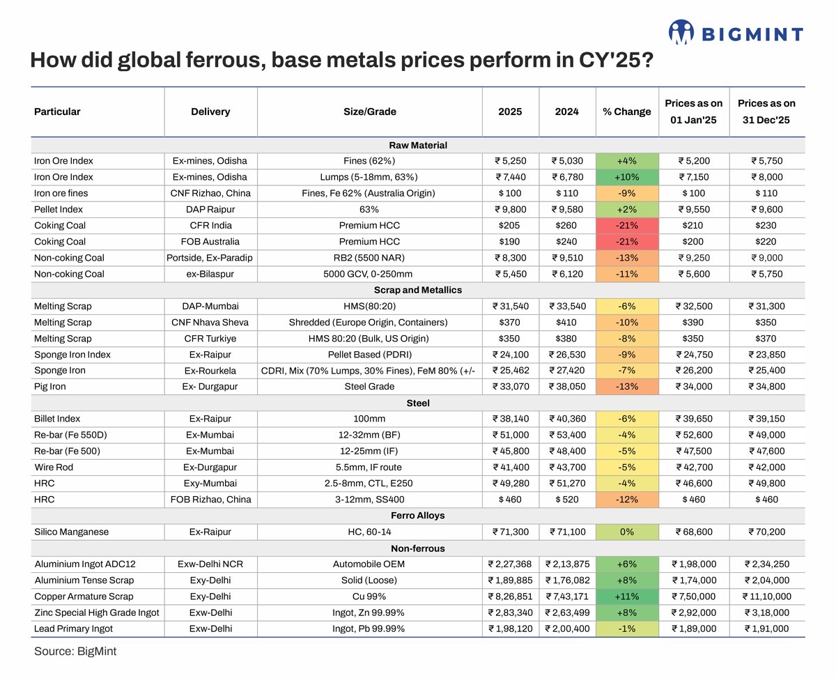 Indian steel and raw material prices moved lower in CY’25 on a yearly average basis, pressured by a prolonged monsoon, which limited construction activity for a large part of the year. The resultant demand slump, coupled with weak global pricing, cautious buyer sentiment, and robust production growth (in comparison to consumption) pushed several commodities to five-year lows during CY’25. Notably, India’s crude steel production increased 10% to 164 million tonnes (mnt), while consumption rose by a slower 8% to 160 mnt.