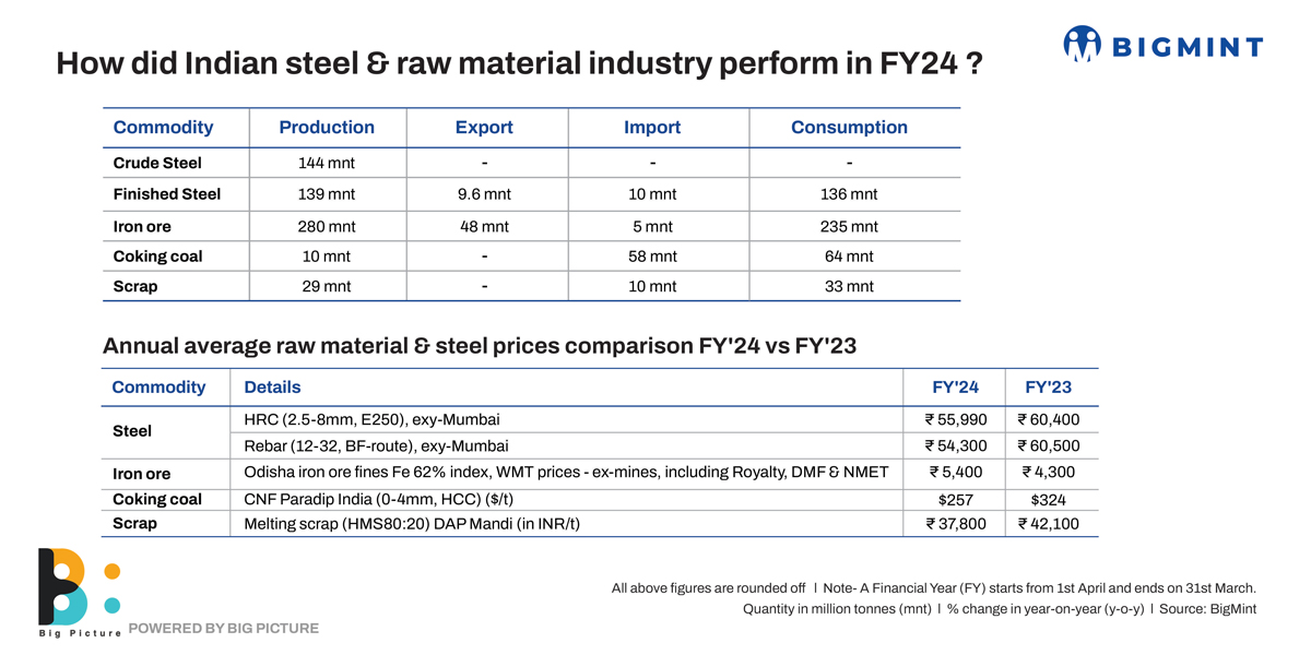 India’s crude steel headed north by 14% in FY’24 to 144 mnt compared to 126 mnt in FY’23. The growth was undoubtedly spearheaded by the IFs whose output grew 25% to 50 mnt against 40 mnt in FY’23 while the EAFs showed 12% growth to 31 mnt. Capacity expansion of around 10 mnt by major IF players contributed to the increase in output too. Further, IF mills with captive sponge iron plus waste heat recovery plants reaped better margins amid the fall in coal prices, encouraging higher production.