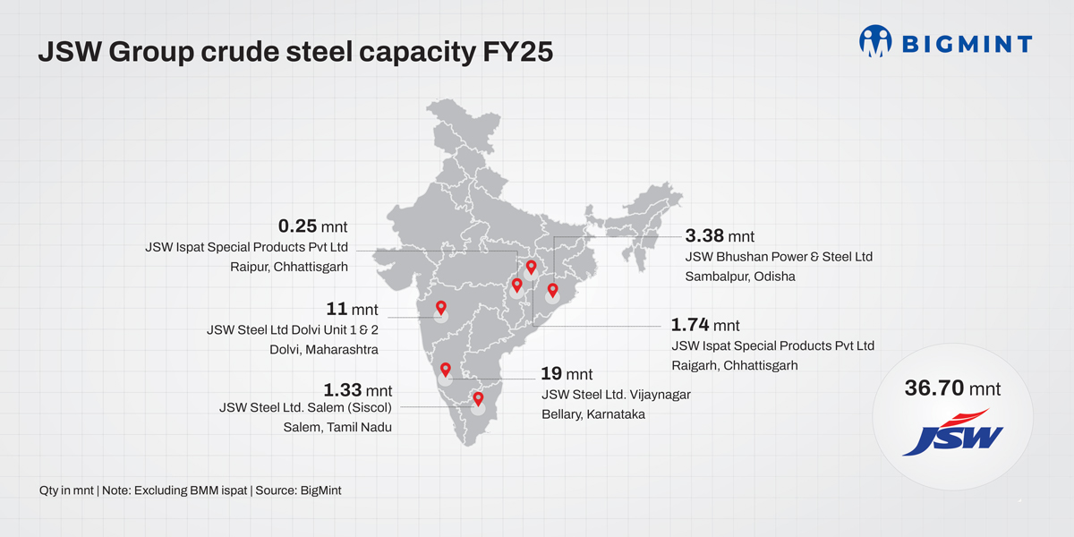 Located in Odisha’s Jharsuguda, BPSL recorded a crude steel production capacity of 3.38 mnt in FY’25, as per BigMint data. The company has HRC capacity of 1.8 mnt and 1.2 mnt of CRC capacity, as well as flat colour-coated and galvanised products and pipes.