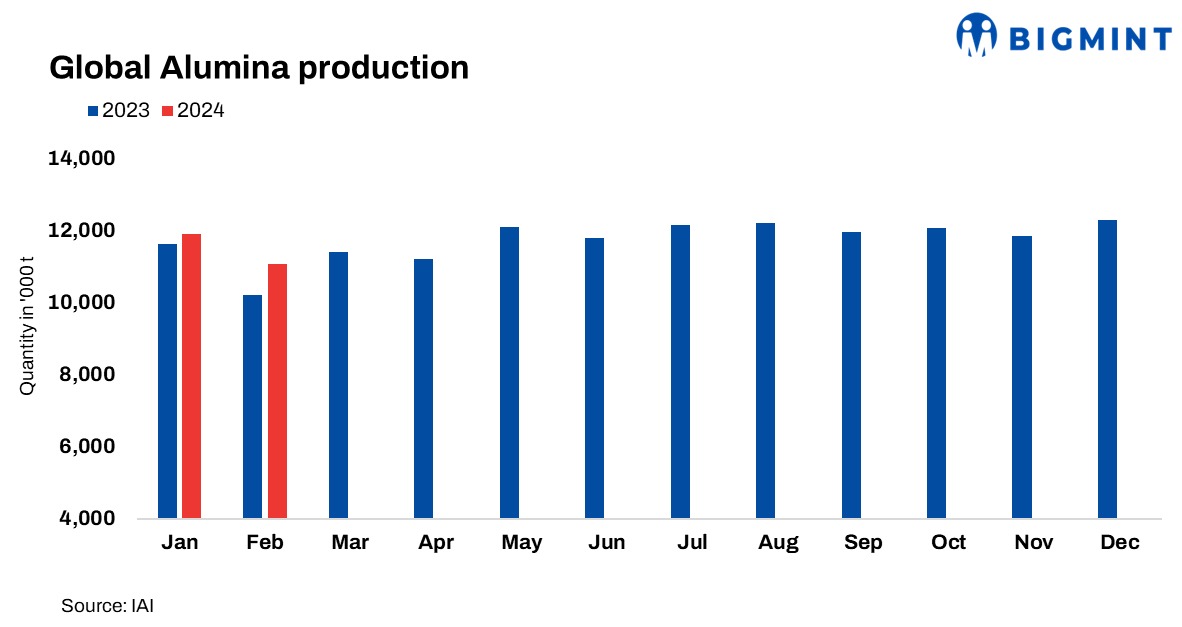 According to the latest data from the International Aluminium Institute (IAI), the alumina production in Feb’24 fell by around 7%, reaching 11.08 mnt from 11.90 mnt, a month ago. In contrast, it increased by 6% y-o-y from 10.45 mnt in Feb’23. Notably, China accounted 6.27 mnt, indicating a notable drop of 5.7% m-o-m in Feb’24.