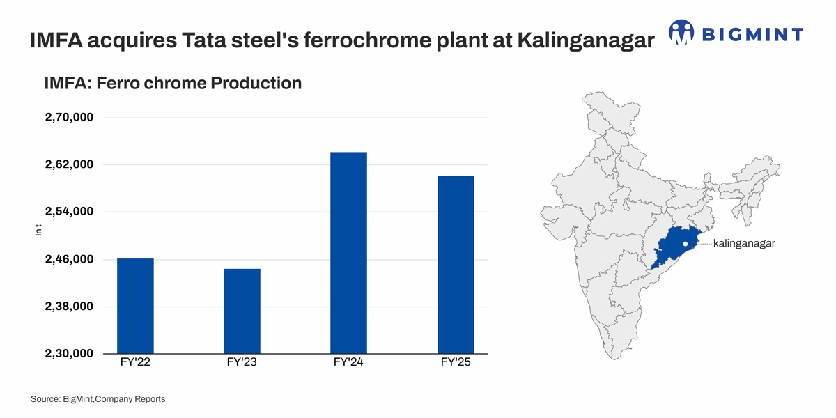 Indian Metals and Ferro Alloys Ltd (IMFA), India’s leading fully integrated ferro alloys producer, has announced the acquisition of Tata Steel Limited’s ferro chrome plant in Kalinganagar, Odisha. The deal, valued at INR 610 crore and fully financed from internal accruals, adds 99 megavolt-ampere (MVA) furnace capacity — 66 MVA existing and 33 MVA under construction — positioning IMFA as India’s largest ferro chrome producer and the sixth largest globally, with over 0.5 million tonnes (mnt) of total annual capacity.