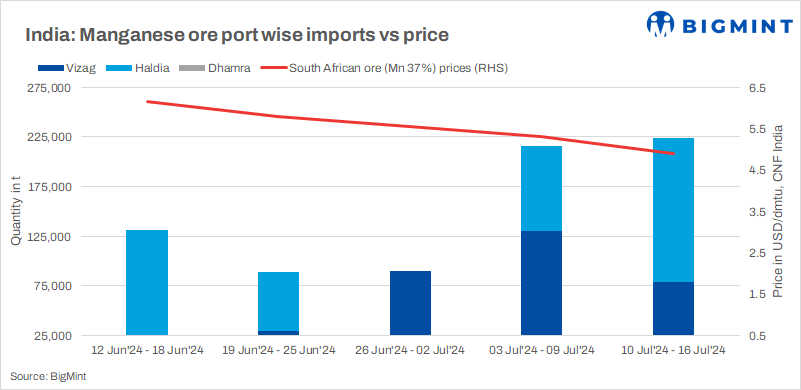 India’s weekly cargo arrivals up by 4% w-o-w: Imported manganese ore cargo arrivals increased by 4% w-o-w at Indian ports (reaching 223,700t between 10 July to 16 July, 2024).
