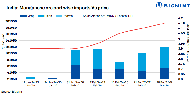 Imported cargo arrivals increase 17% w-o-w: India’s weekly imported shipments of manganese ore (Mn37%, Mn44%, and Mn46%) increased by 17% between 28 February 2024-5 March 2024, reaching 119,815 t, up from 102,024 t in the previous week. The weekly imported amount of manganese ore has been predominantly driven by the recovery caused by rising Mn ore prices.