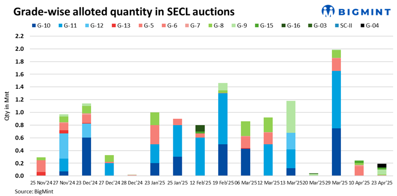 South Eastern Coalfields Limited (SECL) conducted a spot e-auction on 23 April 2025, allocating 183,850 tonnes (t) (0.18 million tonnes) of non-coking coal across five grades. G9 emerged as the most allocated grade, accounting for 44% of the total volume, with strong competition driving bid premiums to as high as 69% above the notified prices.