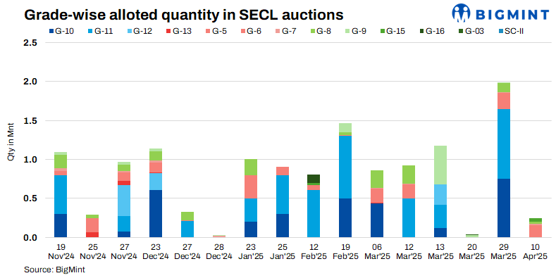 South Eastern Coalfields Limited (SECL) conducted a spot e-auction on 10 April 2025, allocating 232,600 tonnes (0.23 mnt) of non-coking coal across six grades. G6 emerged as the most allocated grade, forming 62% of the total volume, with strong buyer interest pushing bid premiums up to 44% above the notified prices.