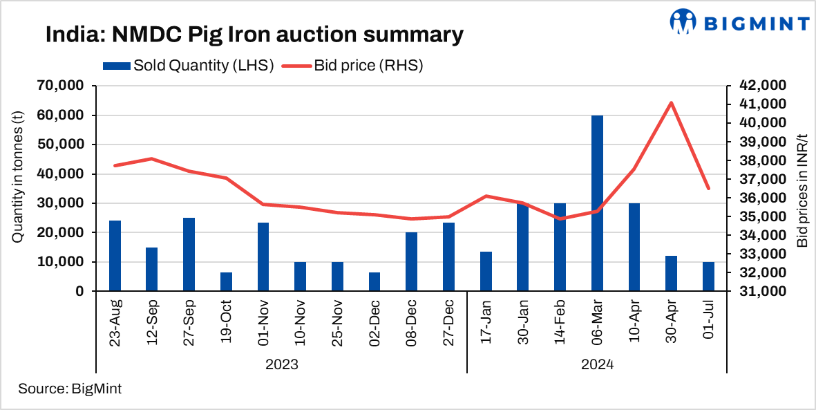 NMDC’s steel plant in Nagarnar, Chhattisgarh, conducted a steel-grade pig iron auction for a total of 23,000 t on 1 Jul’24. 10,000 t was booked at an average price of INR 36,500/t, although management approval is still pending. In the previous approved auction, held on 30 Apr, 10,000 t of pig iron had been booked at an average price of INR 41,100/t.
