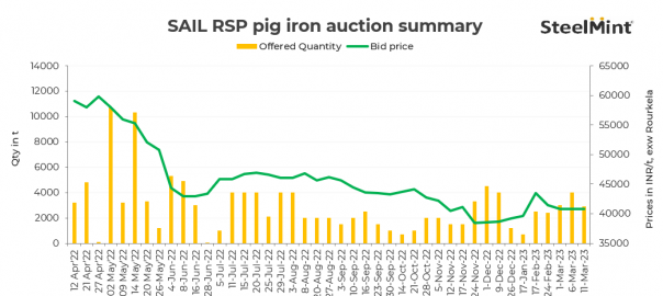 SAIL-Rourkela Steel Plant (RSP) conducted an auction for 2,900 t of steel grade pig iron on 11 Mar’23. About 1,100 t of material was booked at a floor price of INR 40,570/t exw, sources informed. At the last auction conducted on 6 Mar’23, the entire quantity put up for sale i.e., 4,000 t was booked at an average price of INR 40,850/t exw.