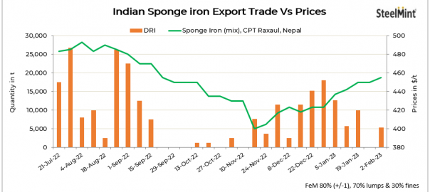 - As per a recent update, 2,700 t of sponge pellets (FeM 79-80%, lumps 70%, fines 30%) were sold to a Nepal-based mill at $390-395/t LTW eastern India (equivalent to $412/t CPT Nepal). In another deal, 2,700 t of sponge iron (FeM 81%) were sold at $430/t LTW ($453/t CPT Nepal).