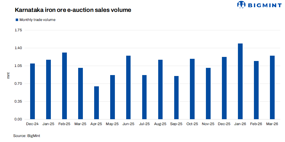 Vedanta Limited conducted an auction for 16,000 t of iron ore lumps from Karnataka on 6 Apr’26. According to sources, 8,000 t lumps (6-40 mm, Fe 54.25%) were booked at INR 4,810/t, 4,000 t siliceous lumps (10-40 mm, Fe 50%) were booked at the base price of INR 2,700/t while 4,000 t siliceous lumps (6-20 mm, Fe 48.5%) were booked at INR 2,710/t . Price is on ex-mine basis and excluding royalty, DMF and NMET.