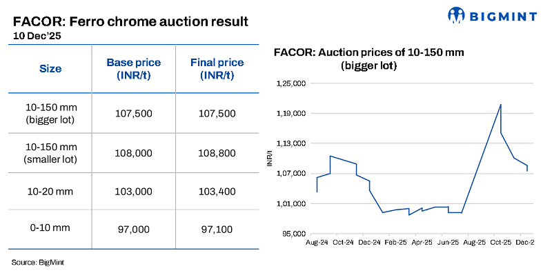 At Vedanta-FACOR’s ferro chrome auction on 10 Dec, about 2,000 t were booked. The larger lot (Cr 57% min, 10-150 mm) achieved an H1 price of INR 107,500/t exw, in line with the base price, while the smaller lot fetched INR 108,800/t, up INR 800/t from the base price.